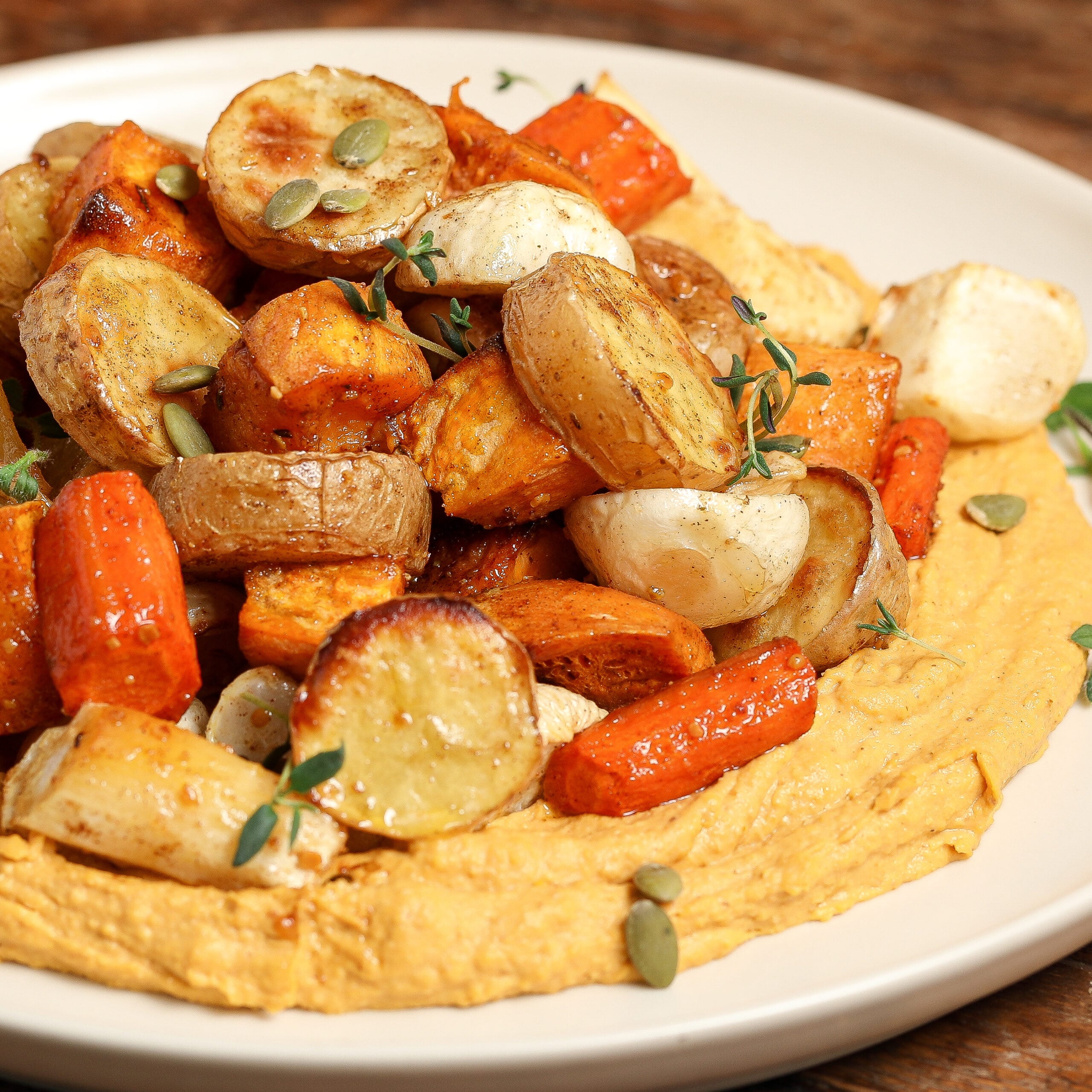 Roasted seasonal vegetables shine when paired with creamy, spiced pumpkin hummus. It’s a colorful, healthy way to celebrate fall flavors.