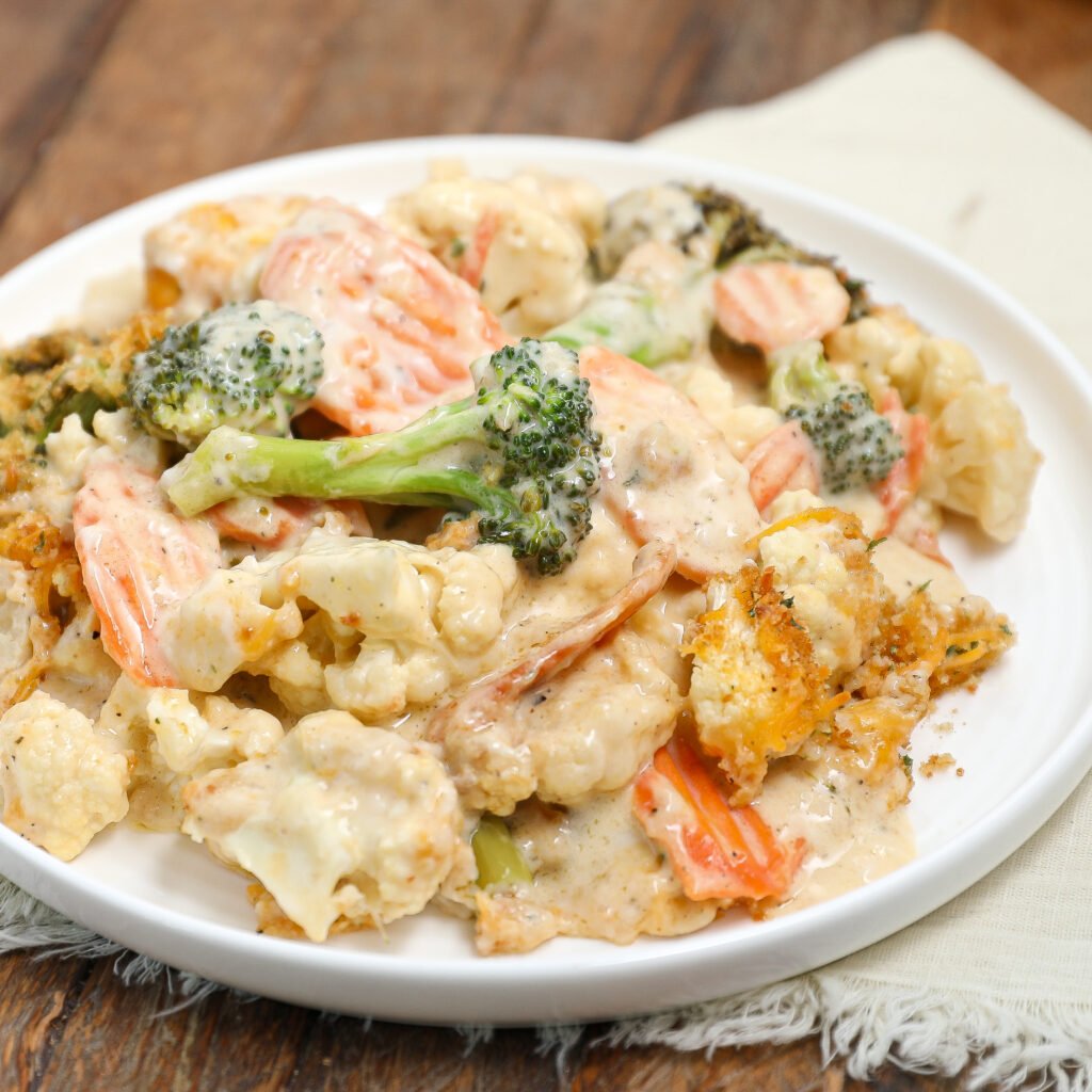 Cheesy Broccoli Cauliflower Carrot Gratin