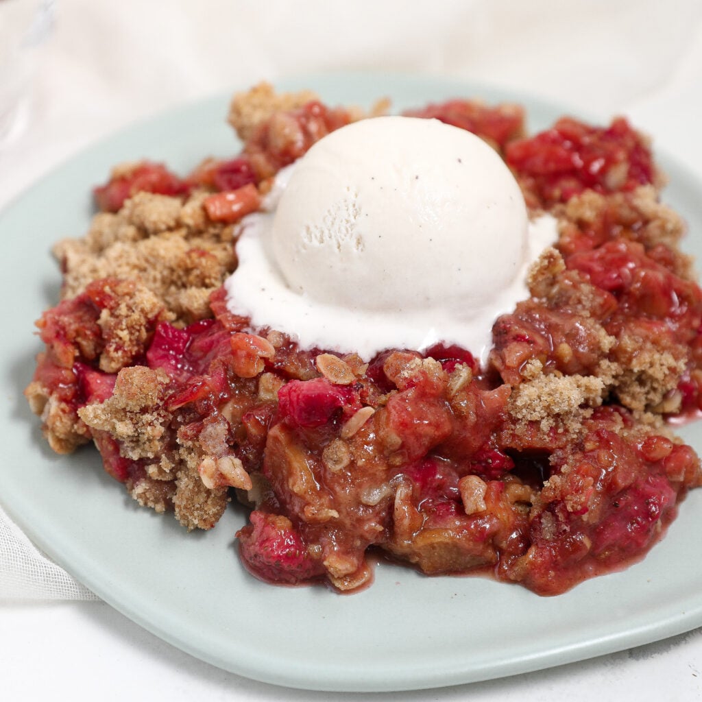 A classic combination of sweet strawberries and tart rhubarb makes this crisp the perfect balance of flavors. The warm, bubbling fruit filling is topped with a crunchy oat and brown sugar crumble that adds the best texture. A hint of cinnamon ties everything together, making each bite comforting and delicious. Serve it warm with a scoop of ice cream for the ultimate treat.