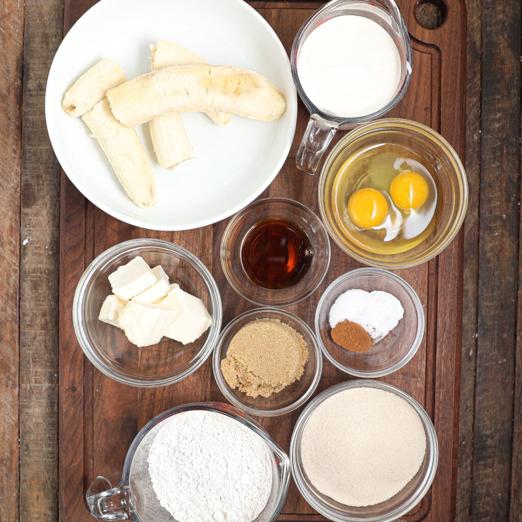 - Make the batter: In a mixing bowl, mash bananas until smooth. Add butter, sugars, eggs, yogurt, and vanilla; whisk to combine. Stir in flour, cinnamon, salt, and baking soda until just combined.