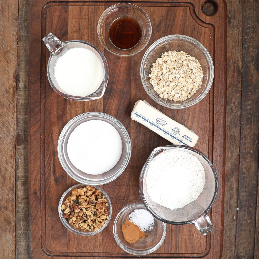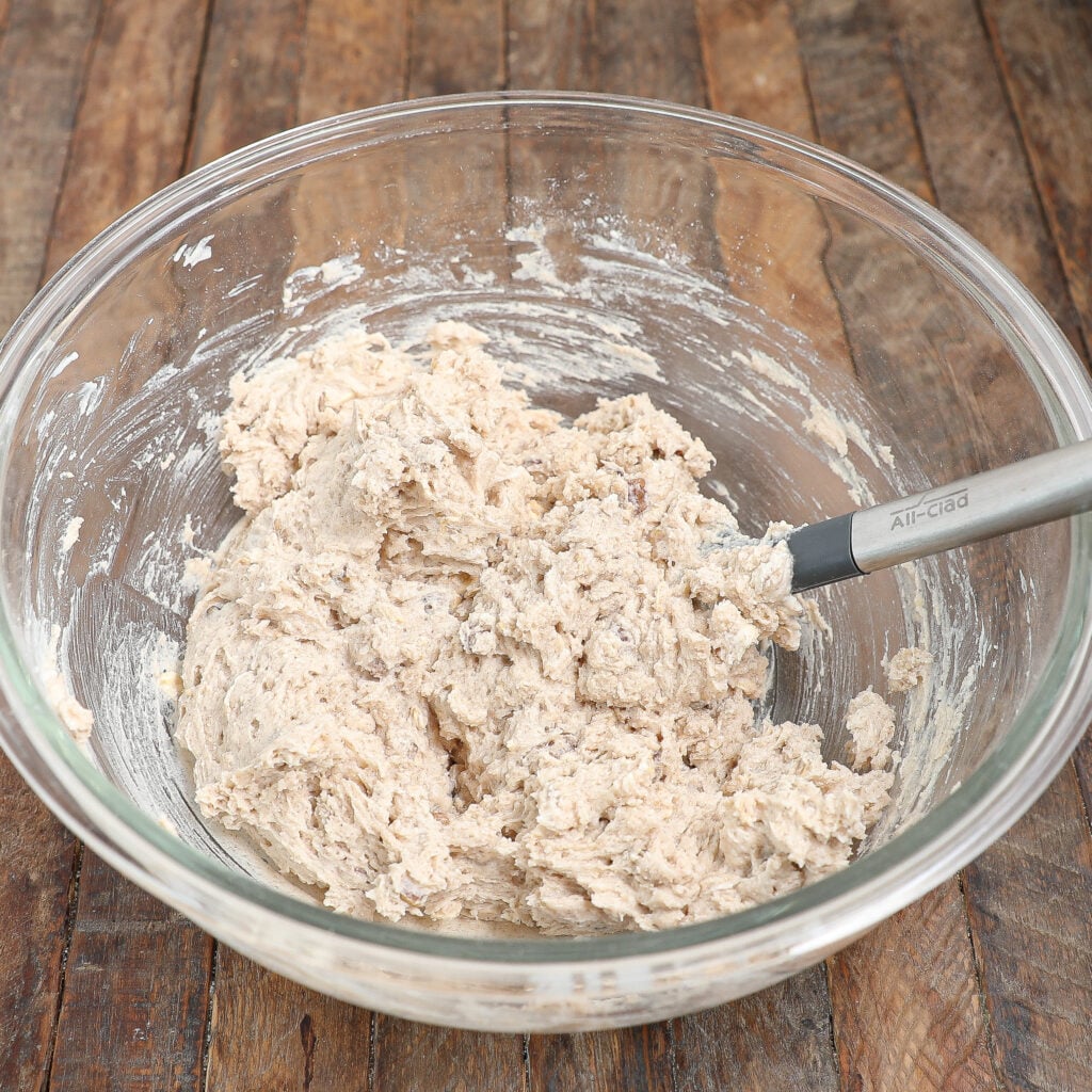 - Add the wet ingredients: Stir in the vanilla, buttermilk, walnuts, and oats to the dry mix until everything’s combined.