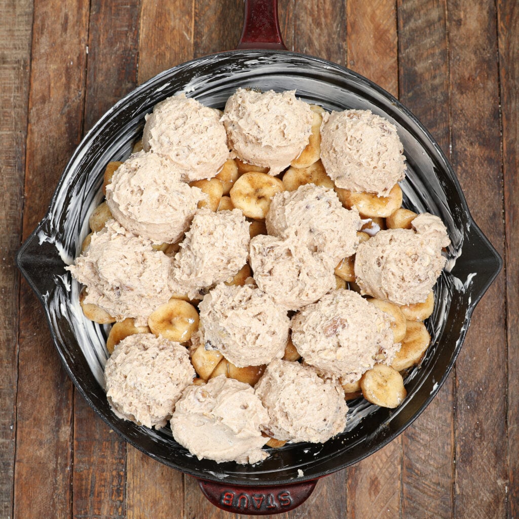 - Using an ice cream scoop, drop spoonfuls of batter evenly over the banana filling.