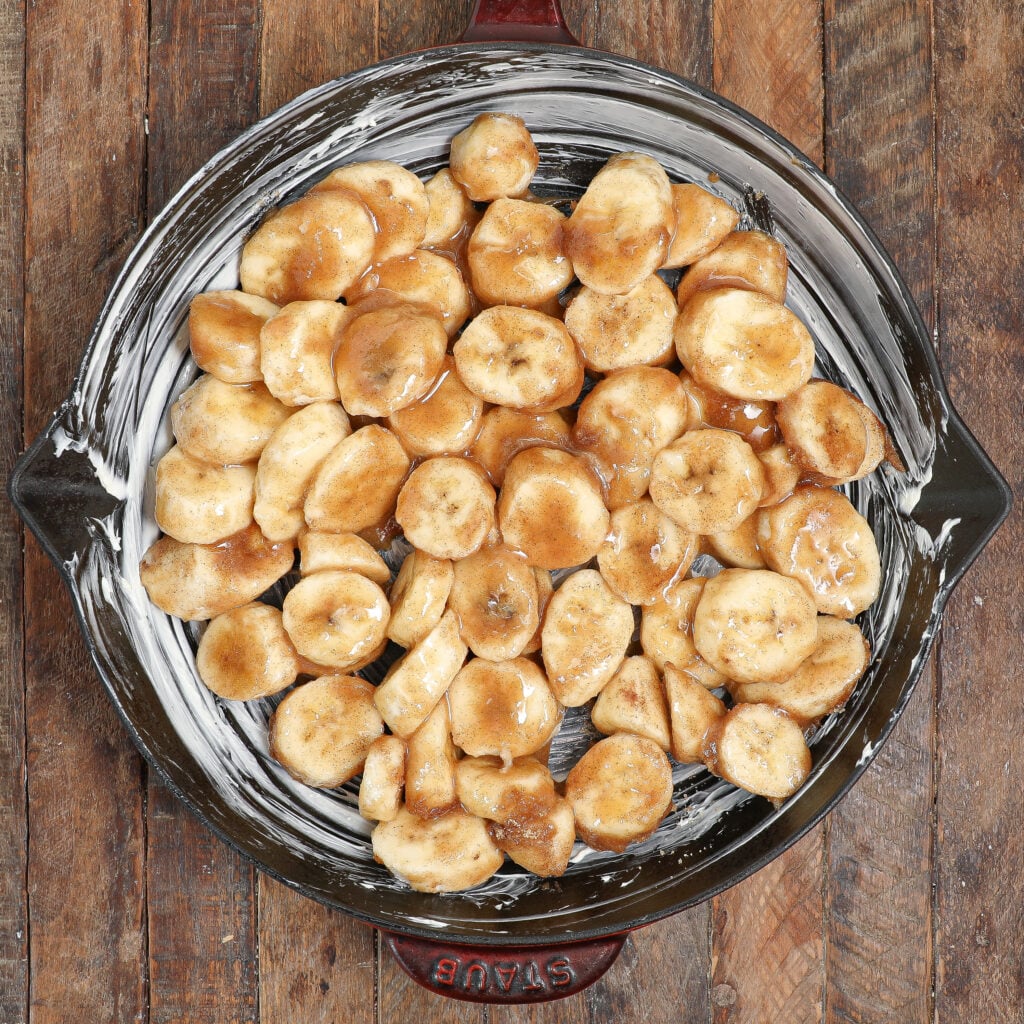 - Make the banana filling: Gently toss the sliced bananas, brown sugar, cinnamon, allspice, cornstarch, and vanilla in a bowl. Pour this mixture into the buttered dish.