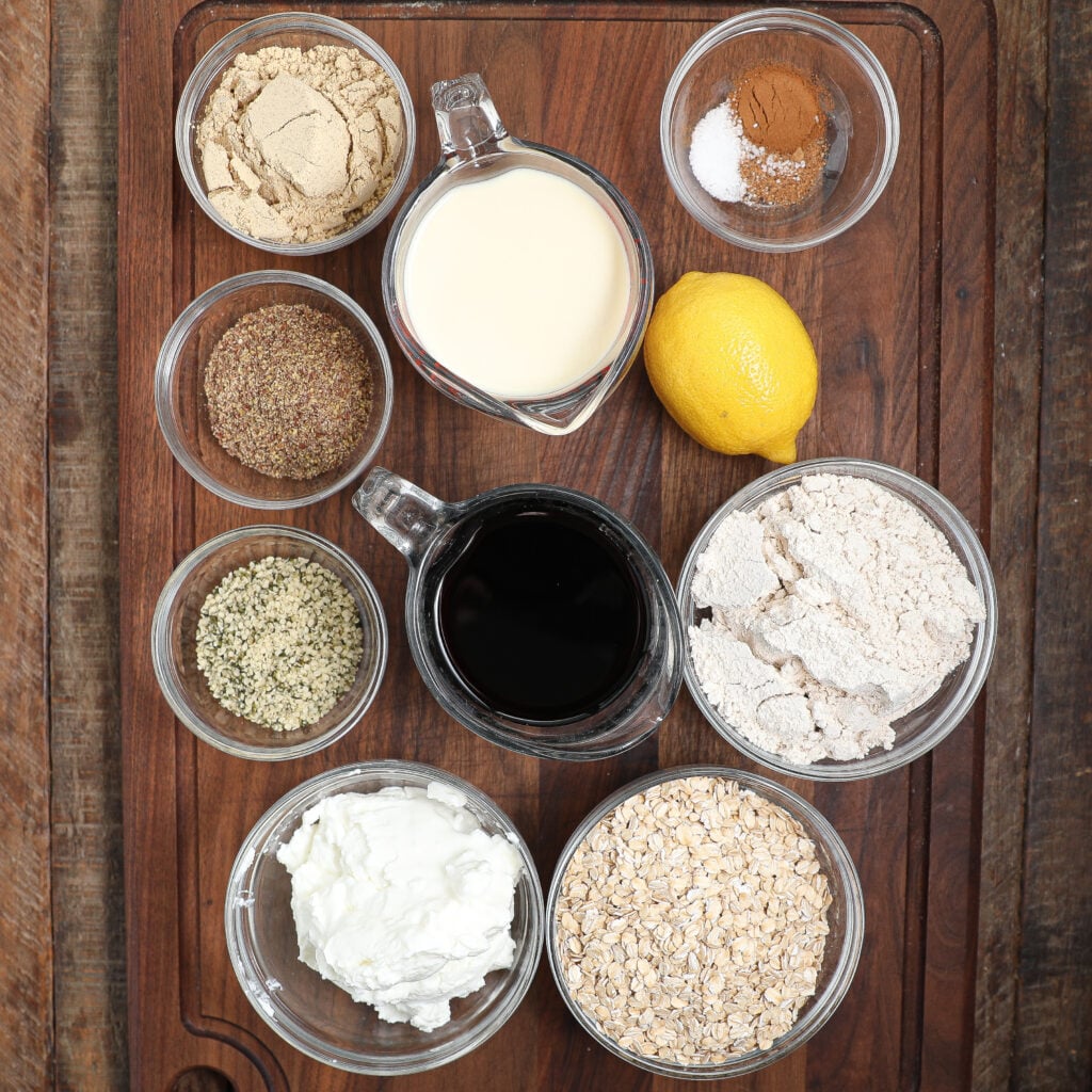 - In another bowl, mix together the dry ingredients: rolled oats, flour, protein powder, cinnamon, nutmeg, baking powder, hemp hearts, flaxseed, and coconut sugar.