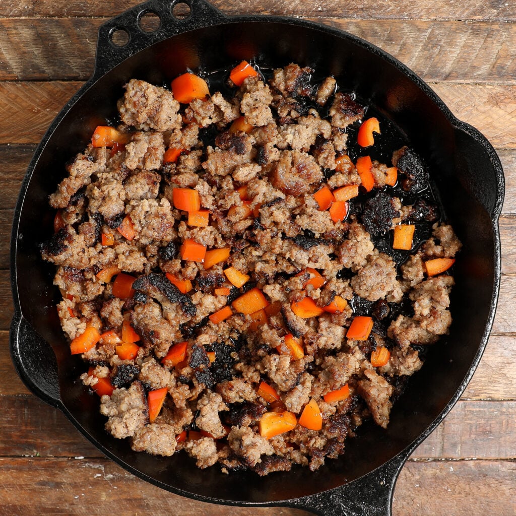 - Cook sausage with diced bell pepper.