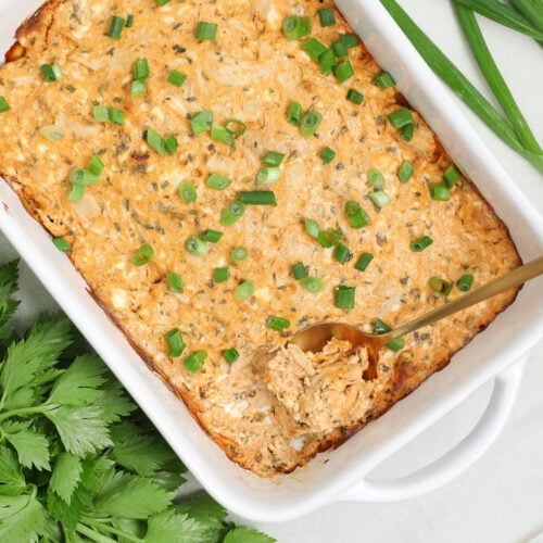 This buffalo chicken dip works because it keeps things simple and focused on flavor. Cream cheese creates a smooth, creamy base while the buffalo sauce adds heat without overpowering the dip. Using cooked chicken makes it quick to assemble and keeps the texture tender, and the garlic powder and chives round everything out so the dip tastes balanced instead of flat.