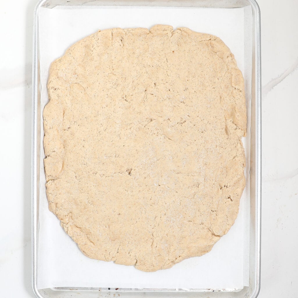 - After the dough rises, press it evenly onto the prepared sheet.