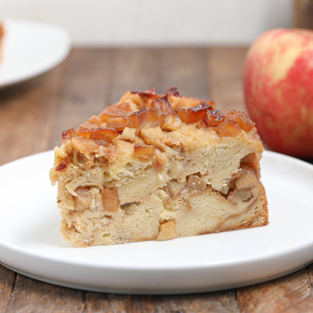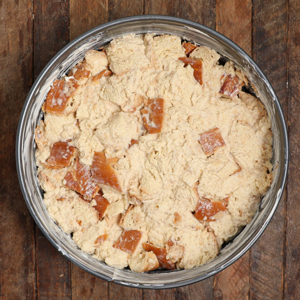 - Add half of the caramel apple mixture, then layer the rest of the bread pudding on top. Press down and top with the remaining apple mixture.