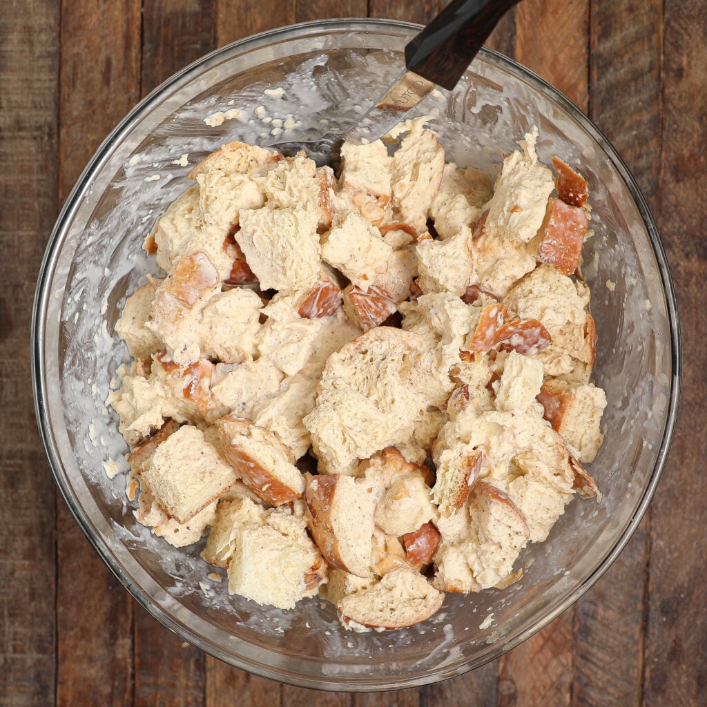 - Prepare the bread pudding mixture: Whisk together cream, sugar, eggs, and vanilla, then mix in the cubed bread.