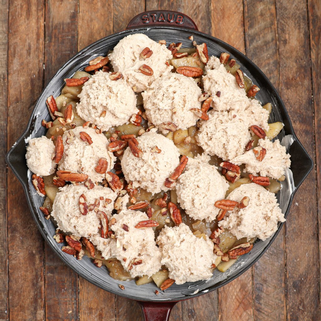 Assemble: Spread 1 can (21 oz) of apple pie filling evenly in the baking dish. Drop spoonfuls of batter over the filling, covering the surface. Sprinkle with chopped pecans.