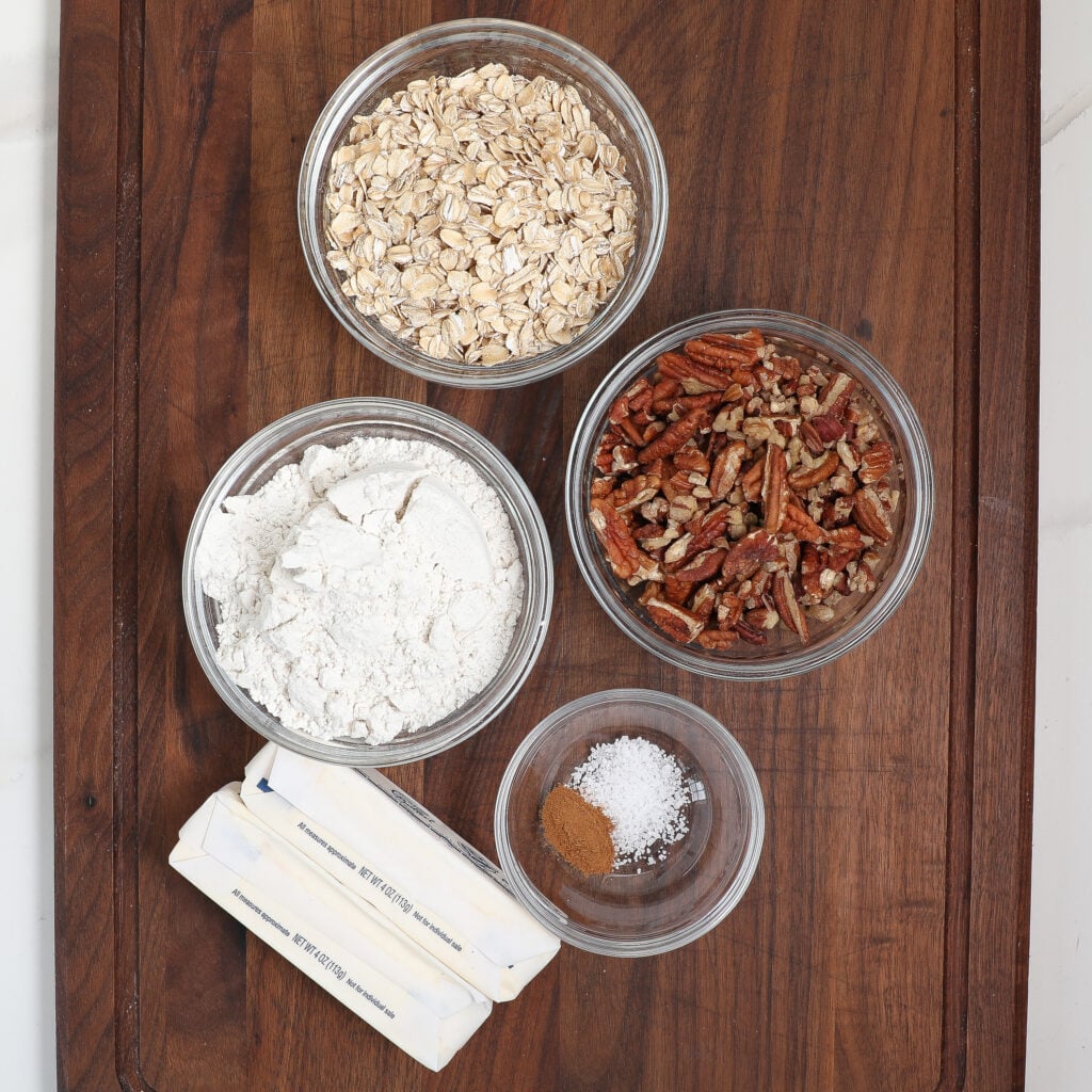 - Mix the Topping: Combine melted butter, flour, oats, cinnamon, salt, and pecans to create a crumbly mixture.