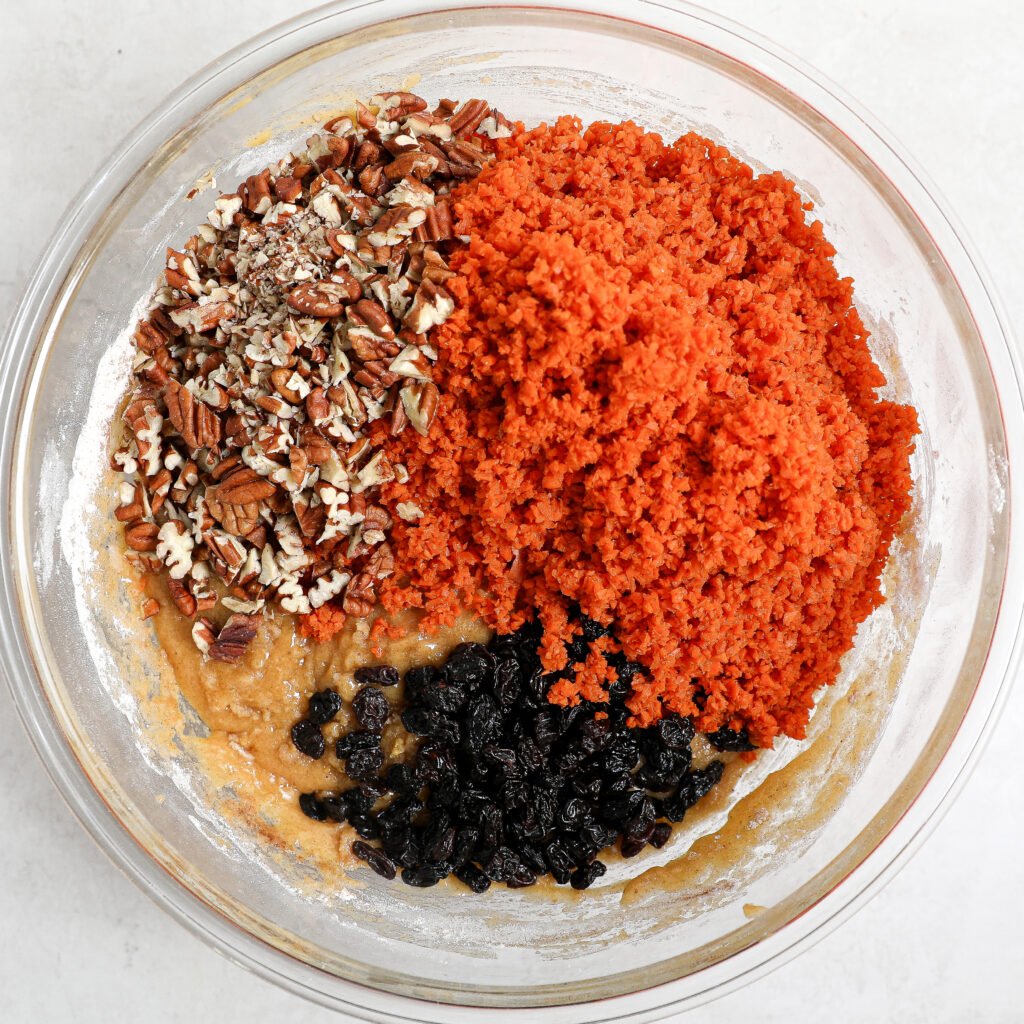 - Gradually add dry ingredients to the wet mixture. When partially mixed, add carrots, pecans, and raisins. Combine thoroughly and pour batter into the pan.
