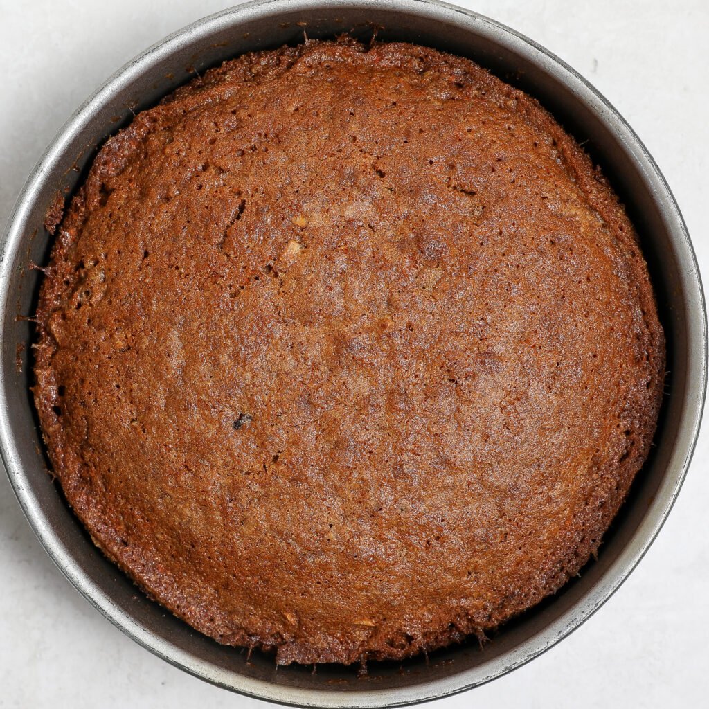 - Preheat the oven to 350°F and spray an 8″ round cake pan with nonstick baking spray.