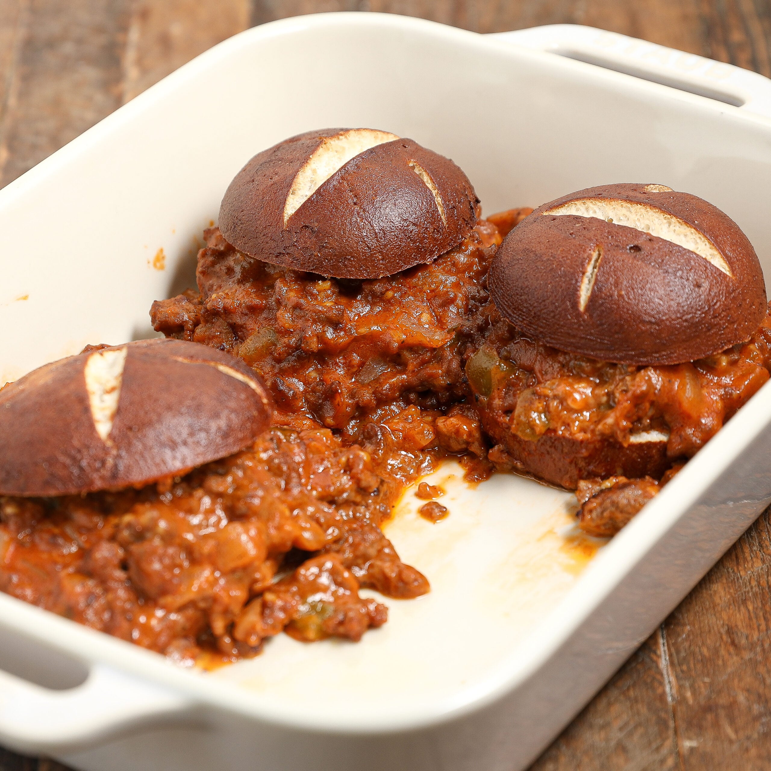 - Assemble the Sliders: Split the pretzel slider buns and place them in a baking dish. Spoon the prepared sloppy joe mixture onto the bottom half of each bun.