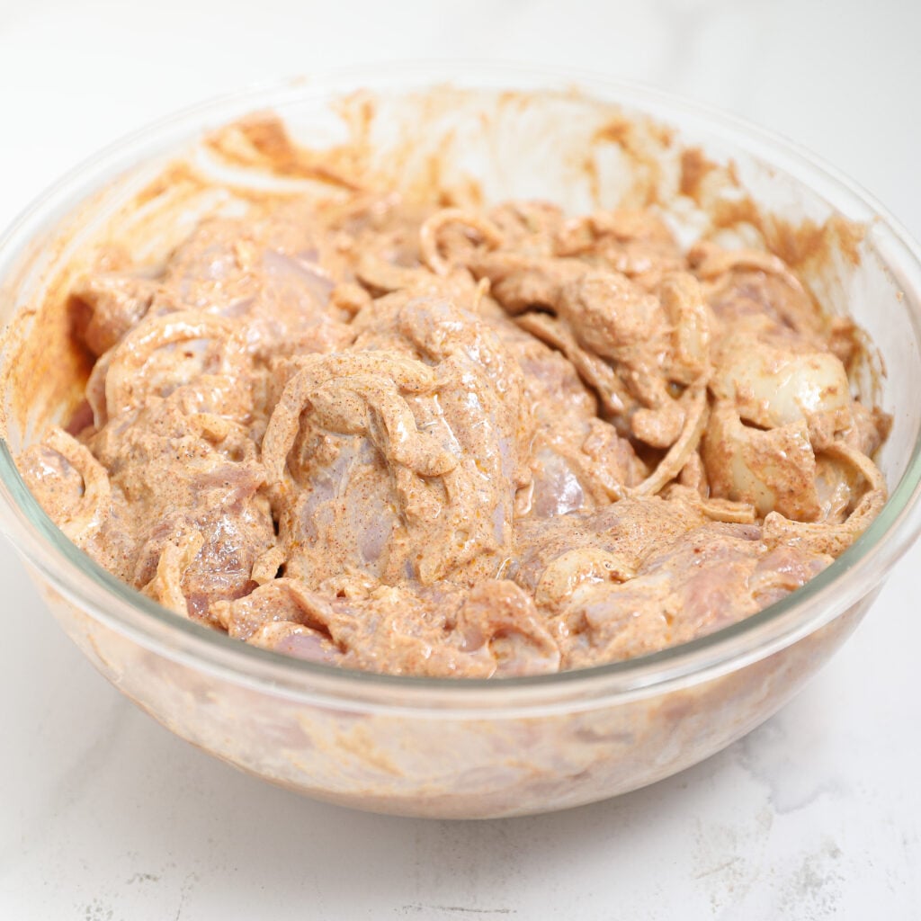 - Marinate the Chicken: Mix the yogurt, spices, lemon juice, olive oil, and sliced onion in a bowl. Add the chicken and coat well. Cover and let it marinate in the fridge for a few hours or overnight.