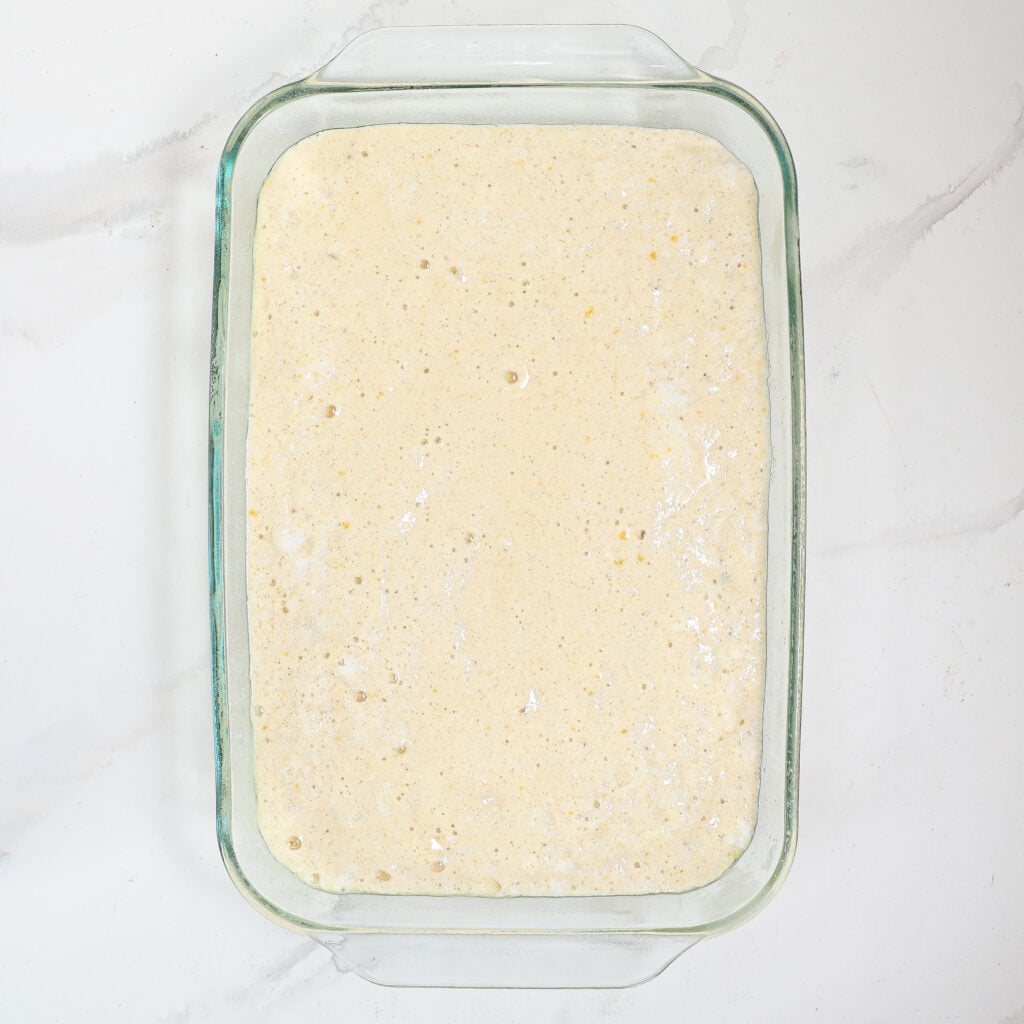 - Pour the batter into the prepared baking dish.