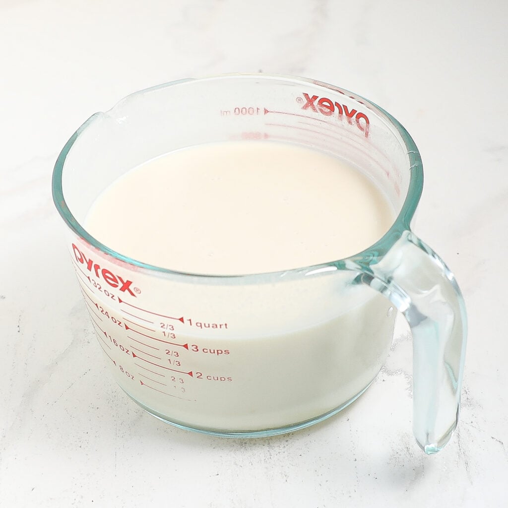 - Mix the evaporated milk, sweetened condensed milk, and lite coconut milk together.