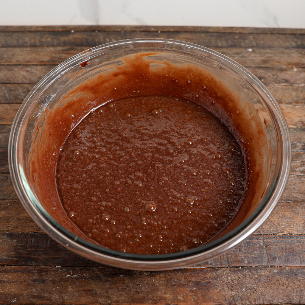 - Mix a bit of chocolate into the egg mixture to temper, then combine. Stir in flour and baking powder.