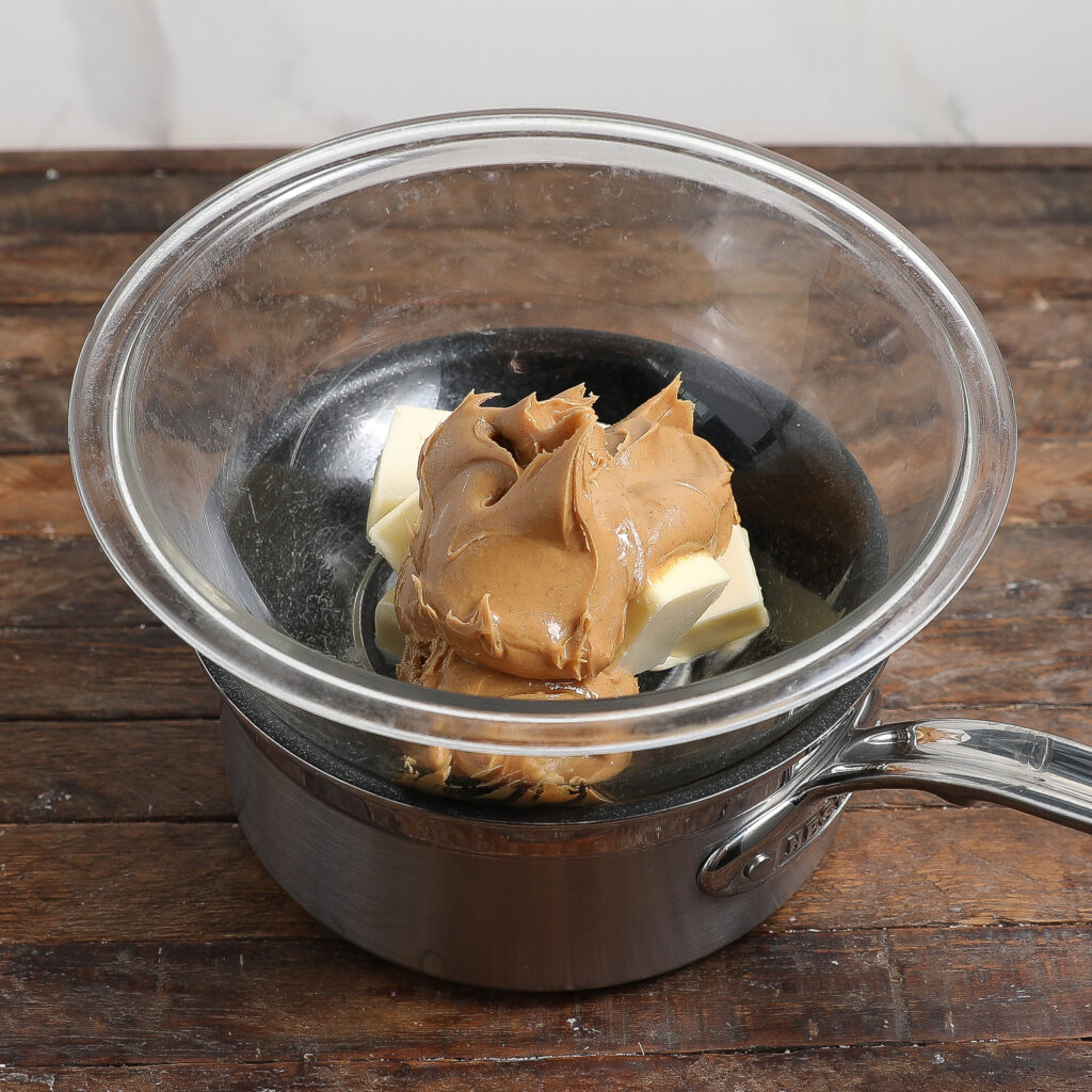 Melt butter and peanut butter over a double boiler, then temper into the egg mixture.