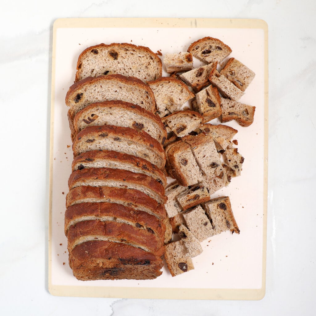 - 5 cups cinnamon raisin bread cubed into 1” pieces