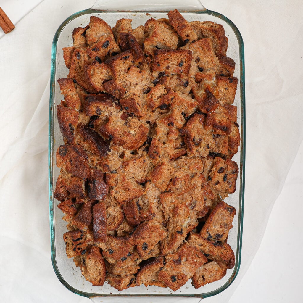 - Add the cubed cinnamon raisin bread to the prepared baking dish. Pour the egg mixture evenly over the bread cubes, ensuring all pieces are soaked.