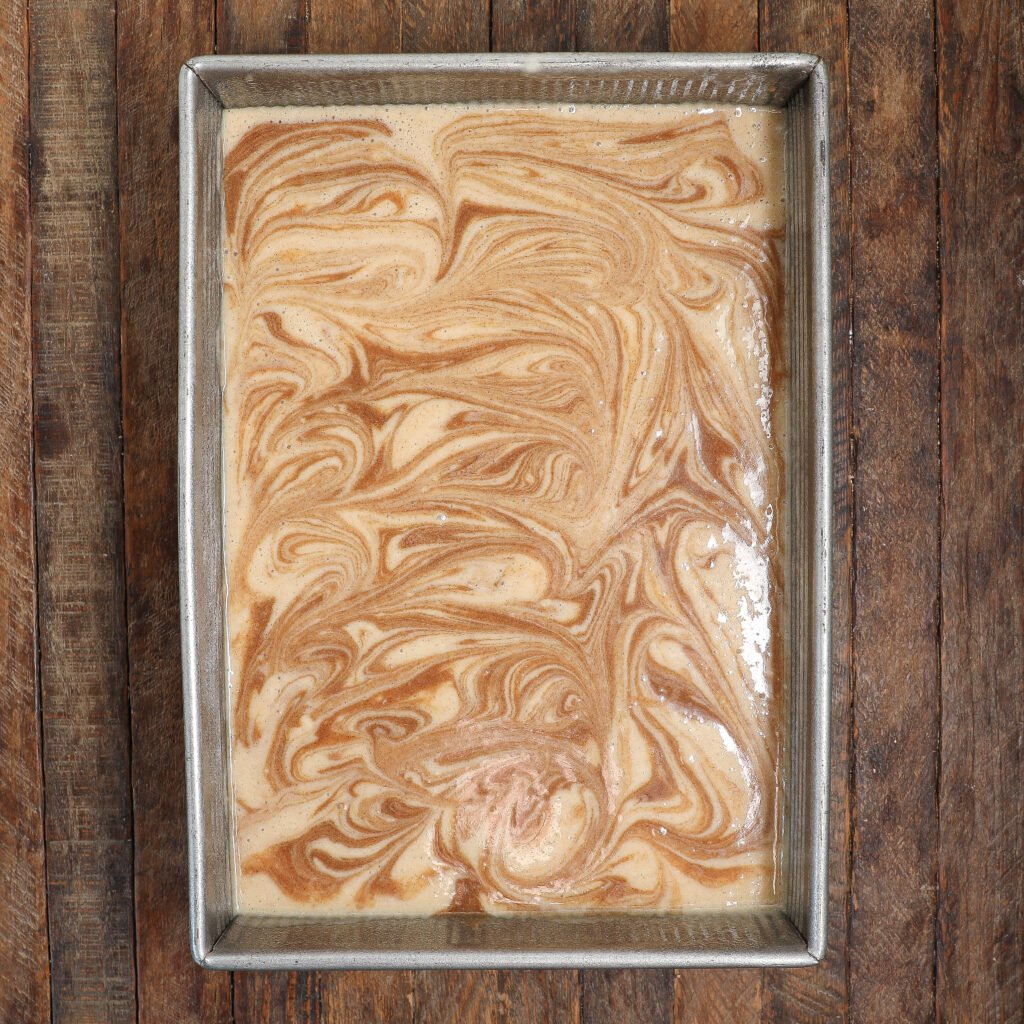 - Create the Swirl: Drop spoonfuls of the cinnamon filling mixture over the top of the cake batter. Use a butter knife to swirl the filling into the batter, creating a marbled effect.