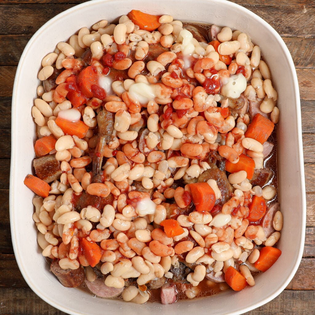 Assemble in Pot: Grease pot, layer beans and meats, and pour demi-glace over. Drizzle with duck fat.