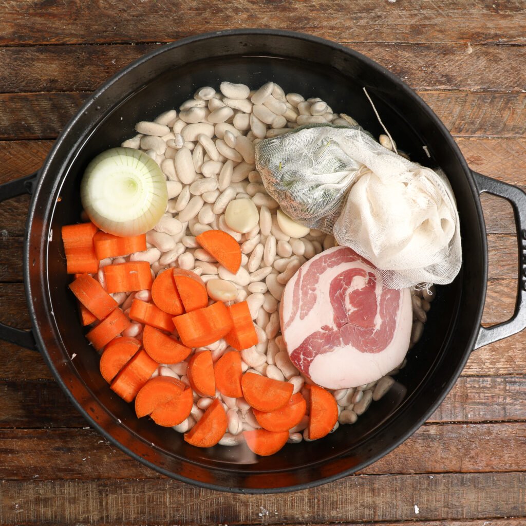 - Drain the beans and transfer them to a large, heavy pot. Remove the plastic sleeve from the ventrèche, slice it in half (reserving the second half), and place one half on top of the beans. Add garlic, carrot, and bouquet garni. Add the smashed garlic and cut onion to the pot. Pour enough cool water to cover the mixture by at least 3 inches. Bring to a boil, then reduce heat to low and simmer uncovered until the beans are barely tender, about 1 hour.
