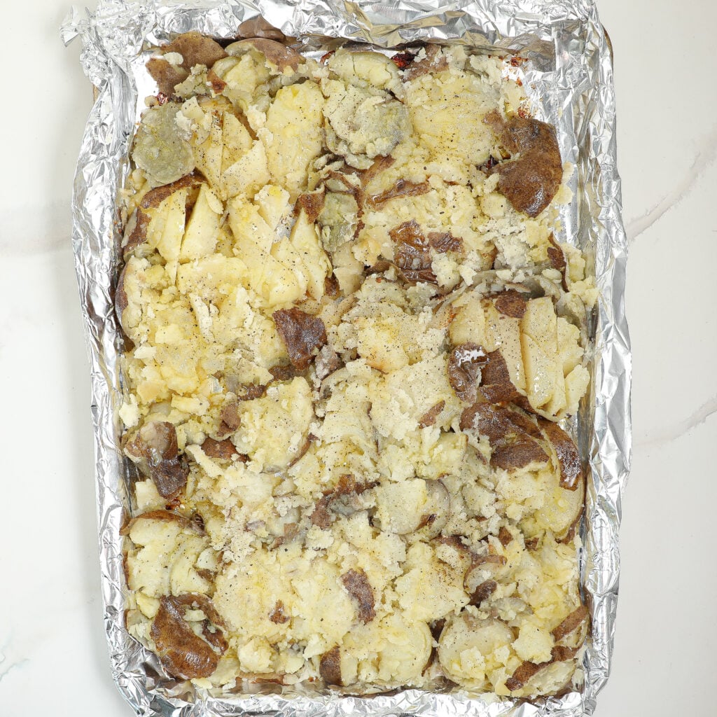 Drizzle the smashed potatoes with olive oil and a sprinkle of kosher salt and pepper.