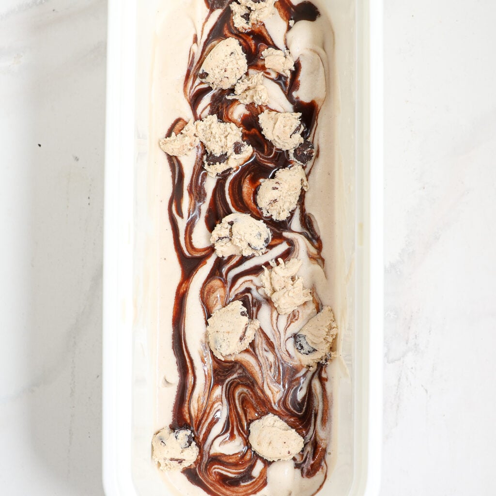 - Add Cookie Dough: When the ice cream is almost set, fold in pieces of the chilled cookie dough.