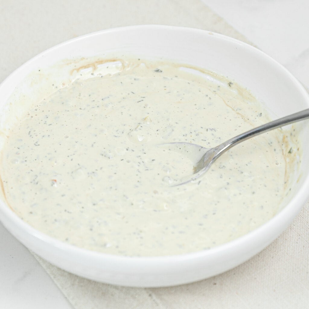 - In a small mixing bowl, combine mayonnaise, ranch seasoning, relish, and Worcestershire sauce. Stir well and set aside.
