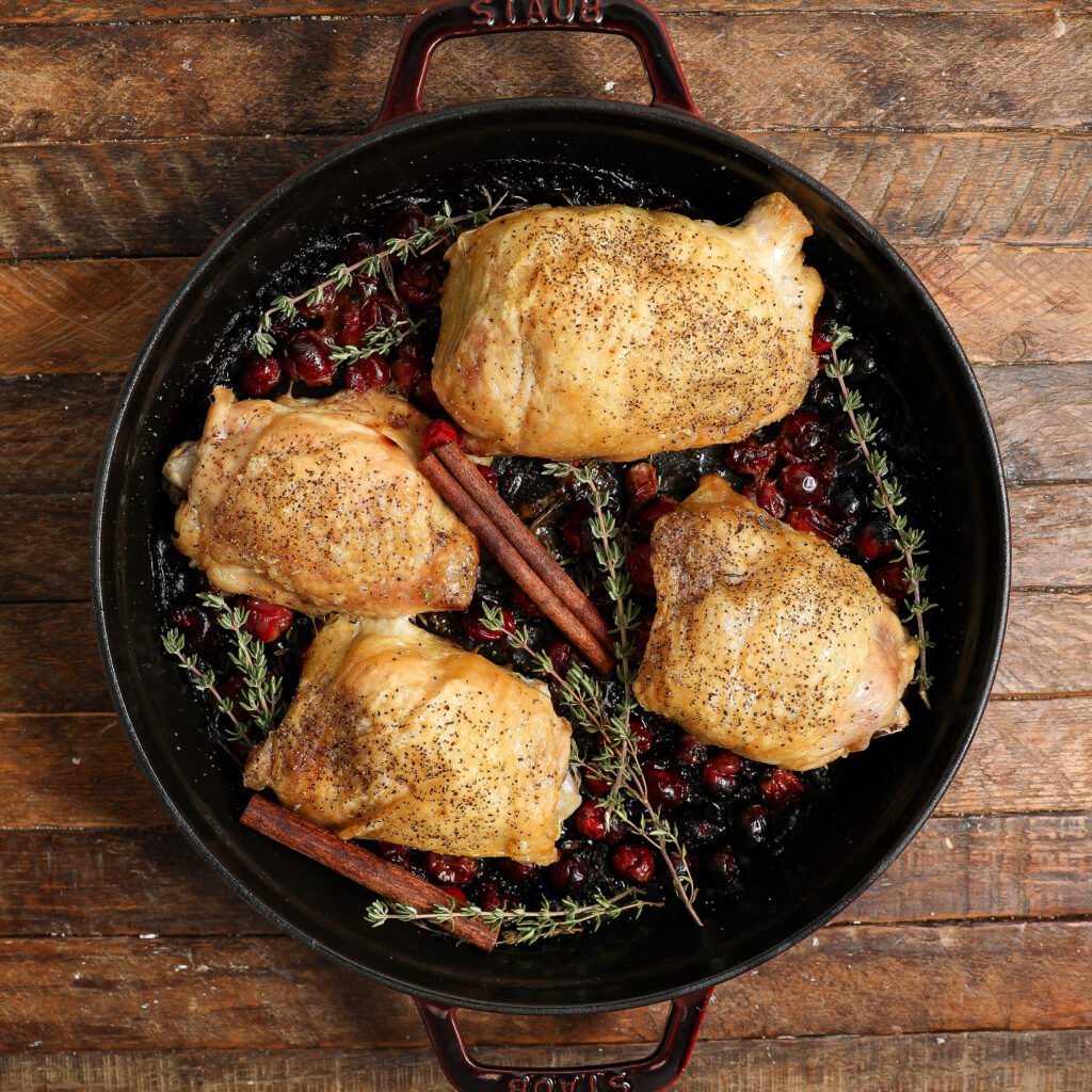 Cranberry Chicken Bake – a dish that’s about to become your new favorite! With just 10 minutes of prep and 20-25 minutes in the oven, you’ll have a fantastic meal on your table in no time. Succulent chicken thighs are nestled on a bed of fresh cranberries and aromatic herbs, and baked to perfection and drizzled with honey for that perfect finishing touch. And don’t worry, it’s not just easy to make; it’s also incredibly versatile – fitting for a cozy family dinner or a festive gathering.