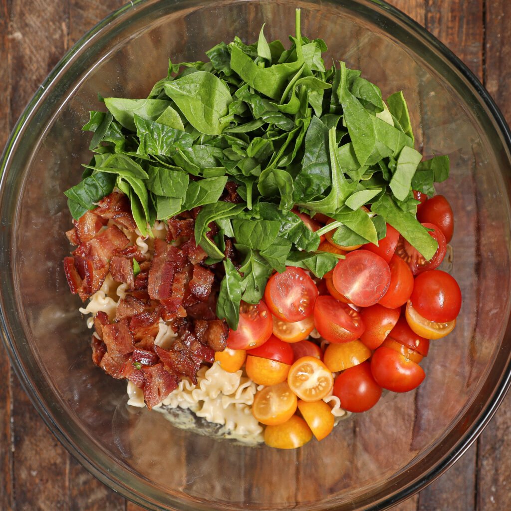 - Now it’s time for all the yummy add-ins. Toss in the chopped fresh spinach, chopped fresh basil, cooked and chopped bacon, and halved cherry tomatoes.