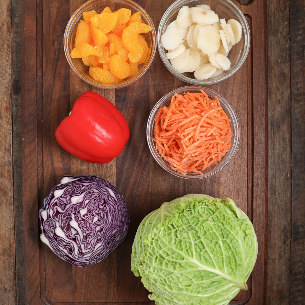 - While the noodles are cooking, prep all the vegetables: slice the red bell pepper, green cabbage, red cabbage, and green onions. Shred the carrots and drain the water chestnuts and mandarin oranges.