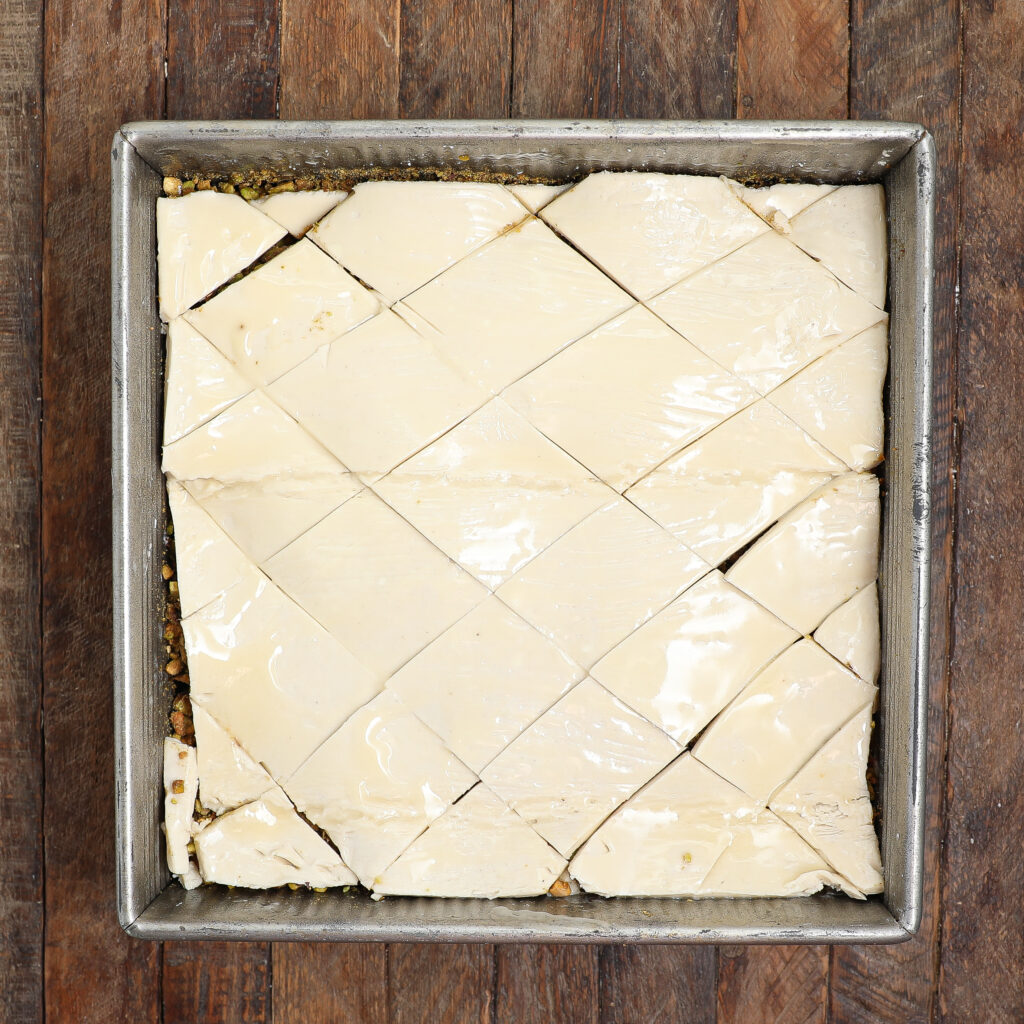 - Cut the Baklava: Using a sharp knife, cut the baklava on the diagonal into 1½" strips to create a diamond pattern.