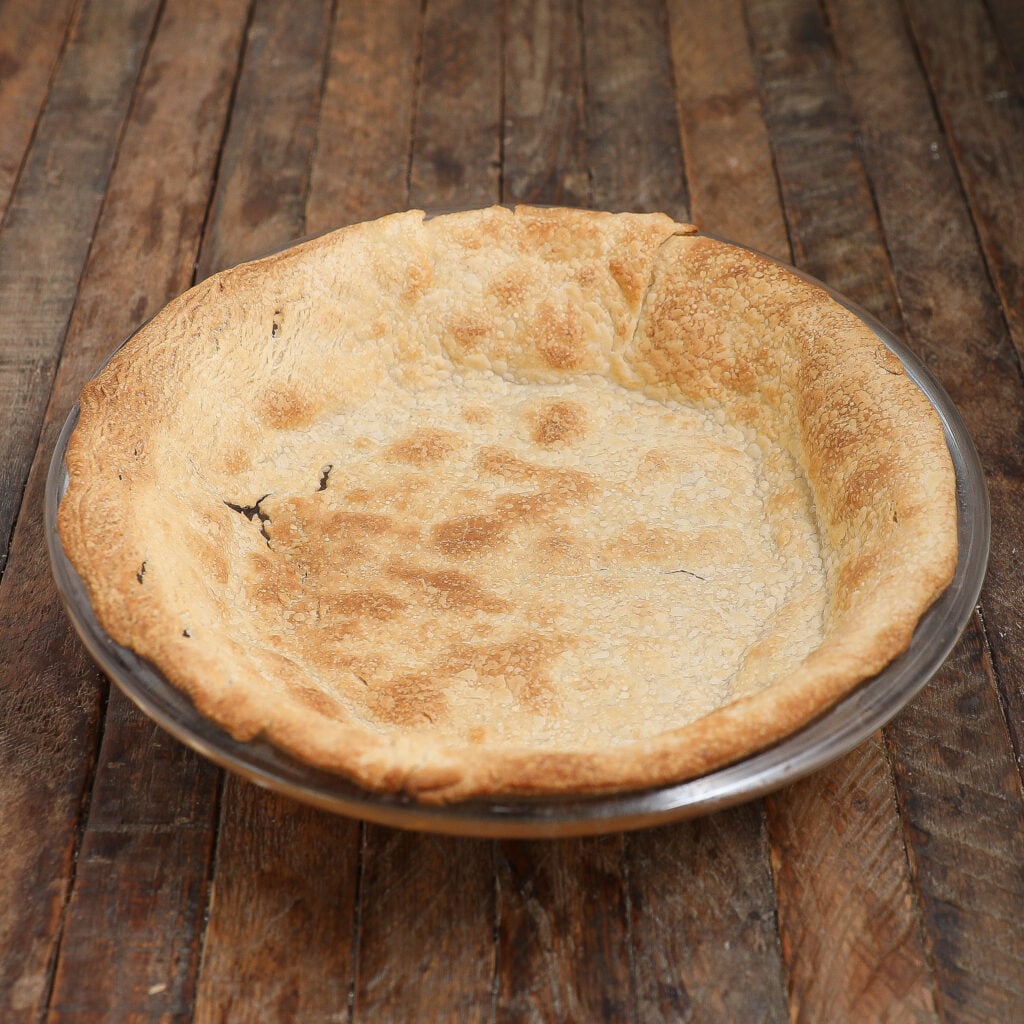 Once you shape the crust into a 9-inch pie dish, add a piece of parchment paper on top and weight it down using pie weights, beans, or rice. This helps weigh down the crust so it doesn’t puff up during baking. You can also poke holes in the crust with a fork to reduce the puffiness.