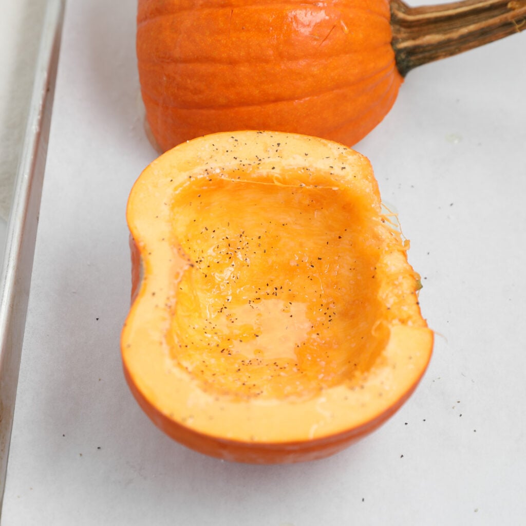 - Place pumpkin halves cut-side down on the parchment-lined baking sheet.