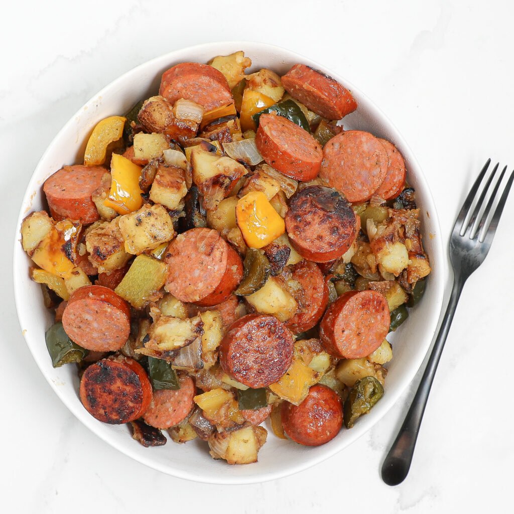 - Prep Your Ingredients: Slice sausage, cube potatoes, and dice the onion and bell pepper.
