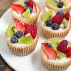 - Once chilled, top each cheesecake bite with fresh fruit (kiwi, blueberries, raspberries, strawberries, or any other preferred fruit).
