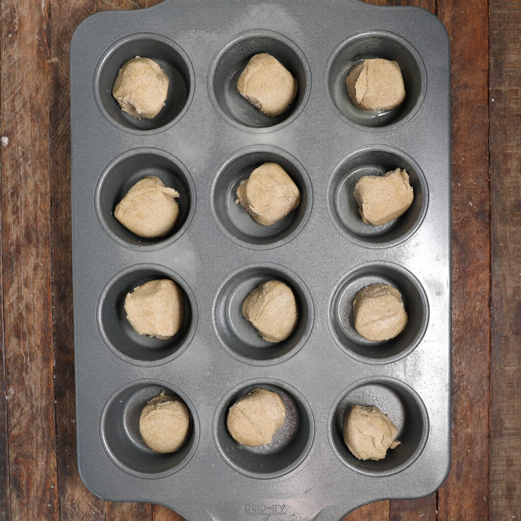 - Break apart the sugar cookie dough and place 1 tablespoon of dough into each muffin tin.