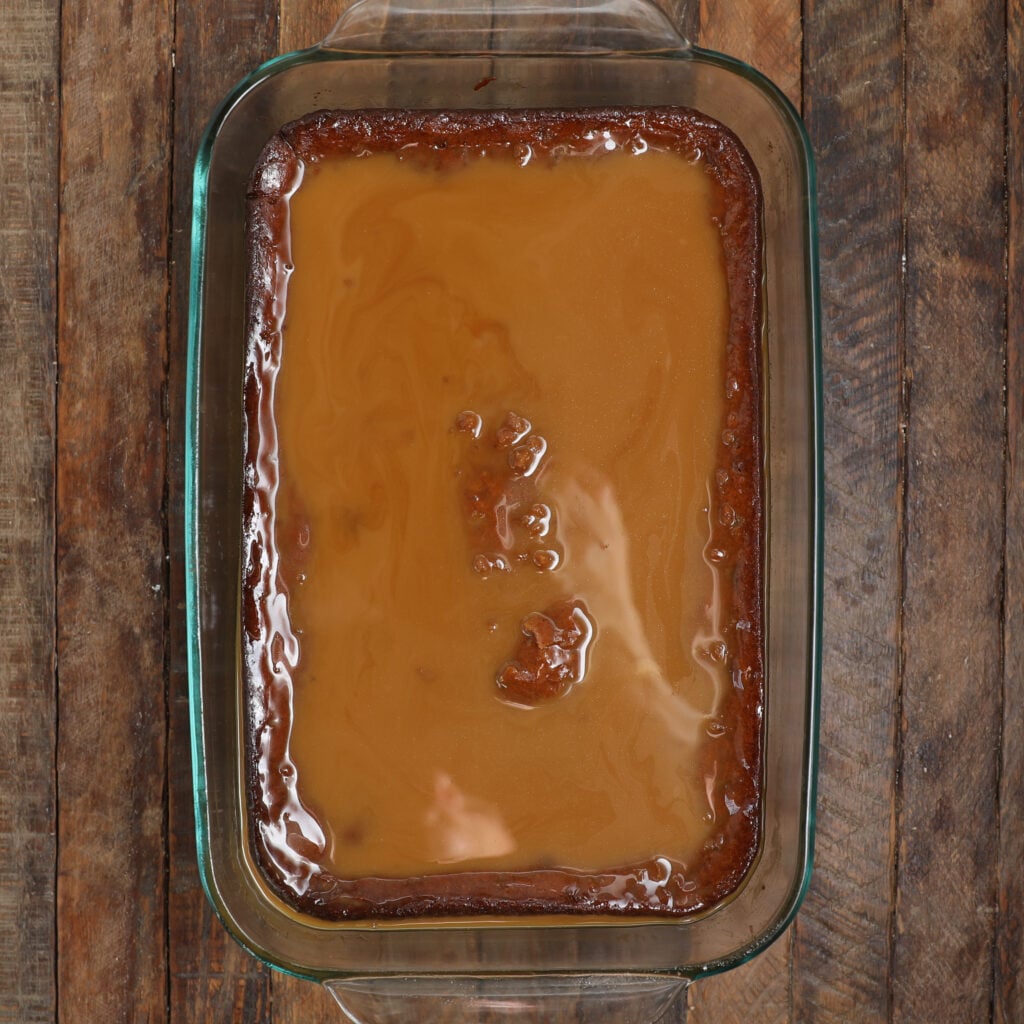 - Pour 3/4 of the toffee sauce over the cake, reserving the rest for drizzling when serving.