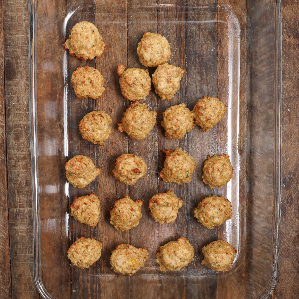 The meatballs are ready when they turn golden brown and reach an internal temperature of 165°F. You can use a meat thermometer for accuracy, or just cut one open to ensure it’s no longer pink inside.