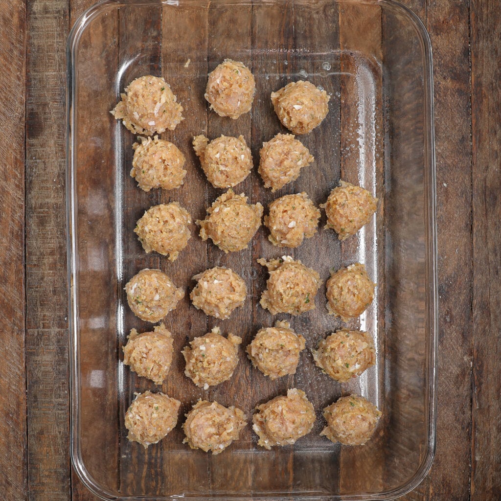 - Using a scoop, portion meatballs into 1" to 1 1/2" balls. Place on the prepared baking sheet and bake for 25-30 minutes until golden brown and internal temp is 165.