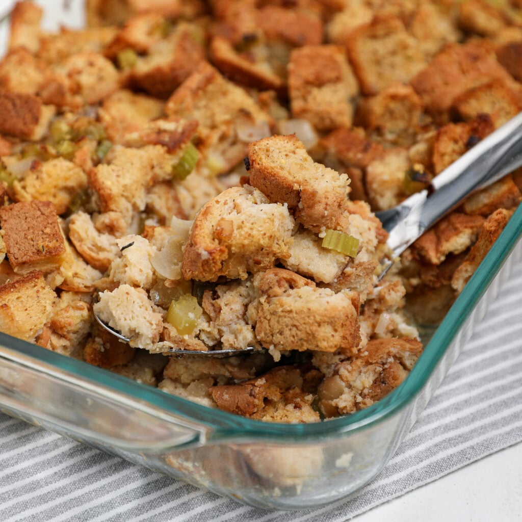 This Herb Bread Stuffing gives you all of the flavors of a holiday classic and must have while being accessible to everyone. Packed with a garden of fresh herbs and it has the sweet flavor of onions and bright note of celery in every bite.