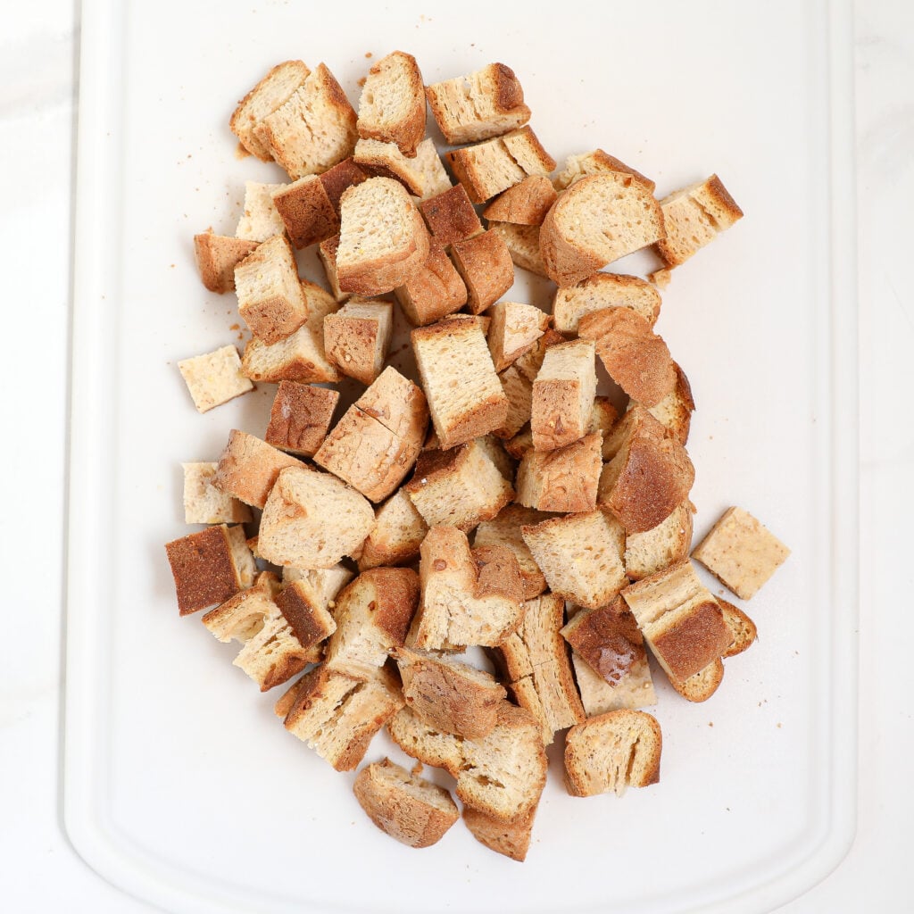 - Spread the cubes of bread out onto baking sheets and allow them to sit out and dry out a few hours.