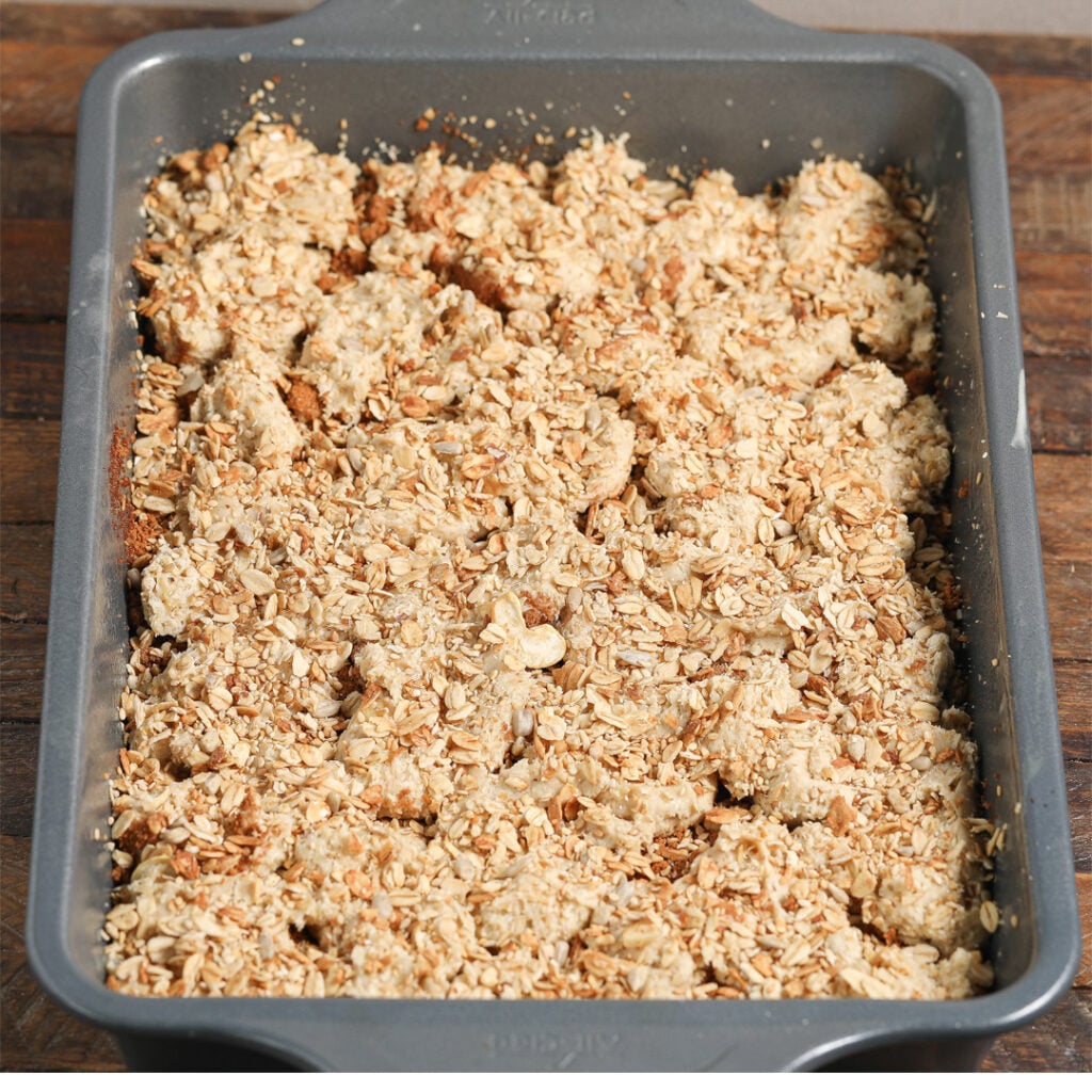 - In a separate bowl, add the sliced almonds, cinnamon, brown sugar, flour, and butter. Mix until crumbles form.