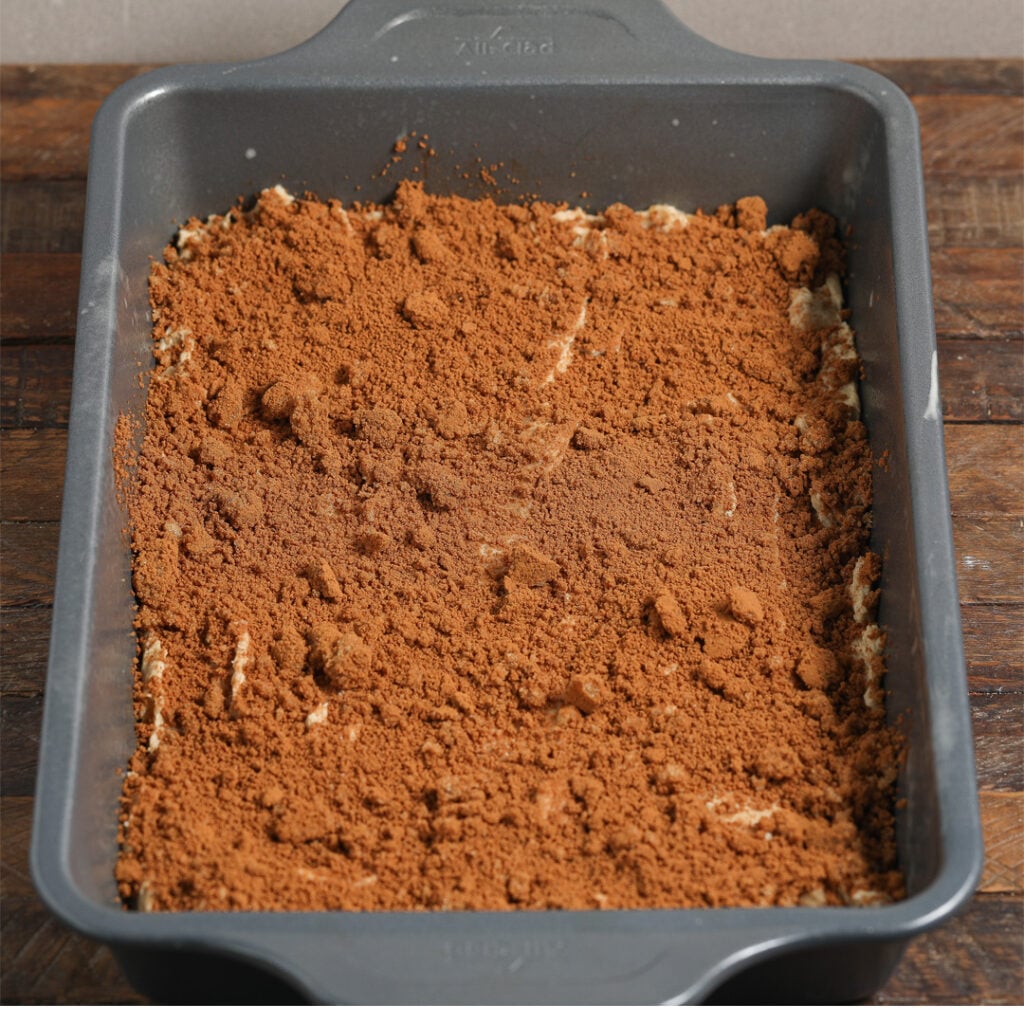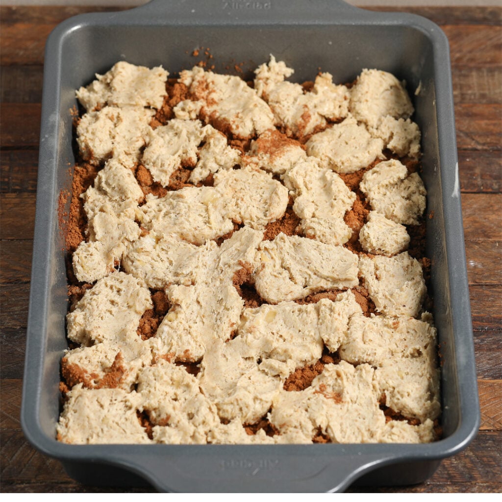 - Spread half of the batter in the prepared baking dish. Sprinkle the cinnamon sugar mixture over it.