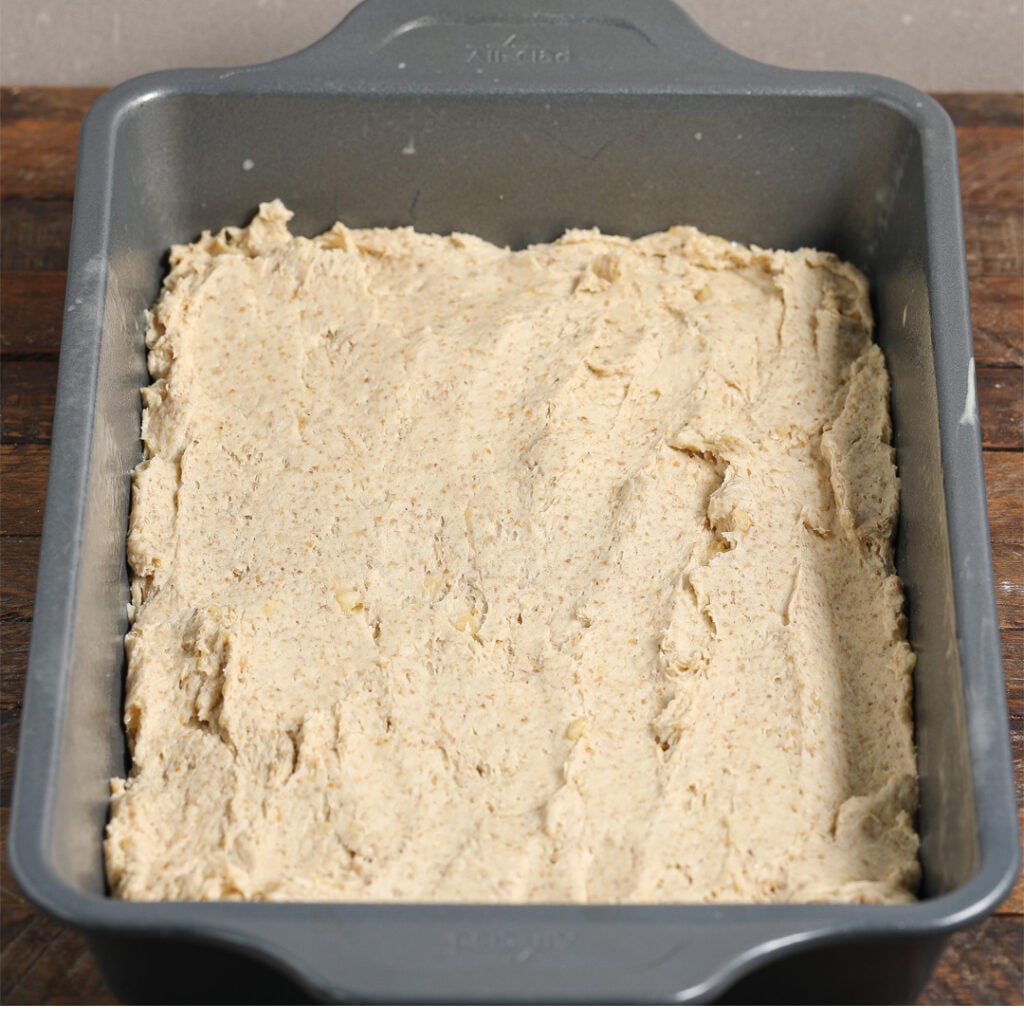 - Add the remaining batter on top and spread it out evenly.