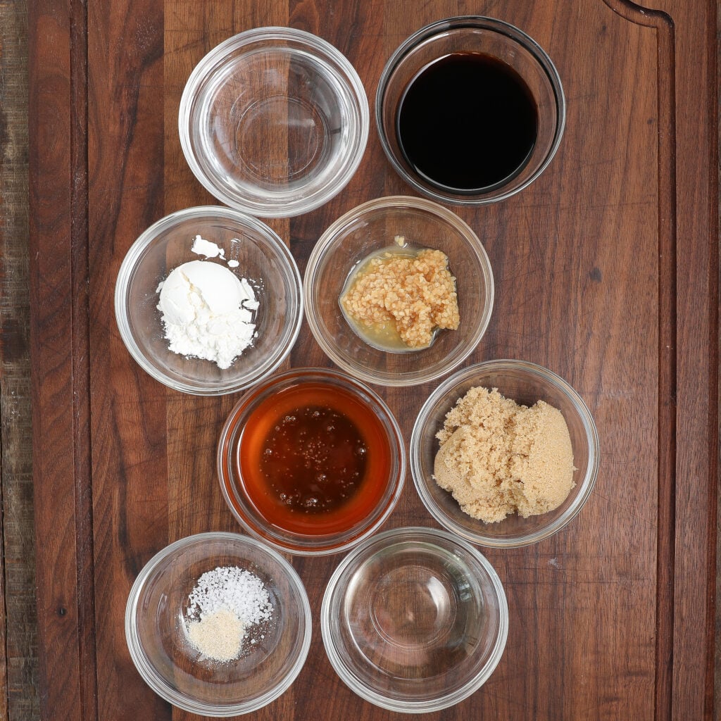 - In a small pot, add soy sauce, water-cornstarch mixture, honey, light brown sugar, rice vinegar, salt, onion powder, and minced garlic.