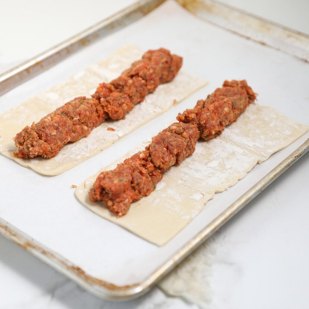 - Place ¼ of the sausage mixture along one side of each puff pastry half.